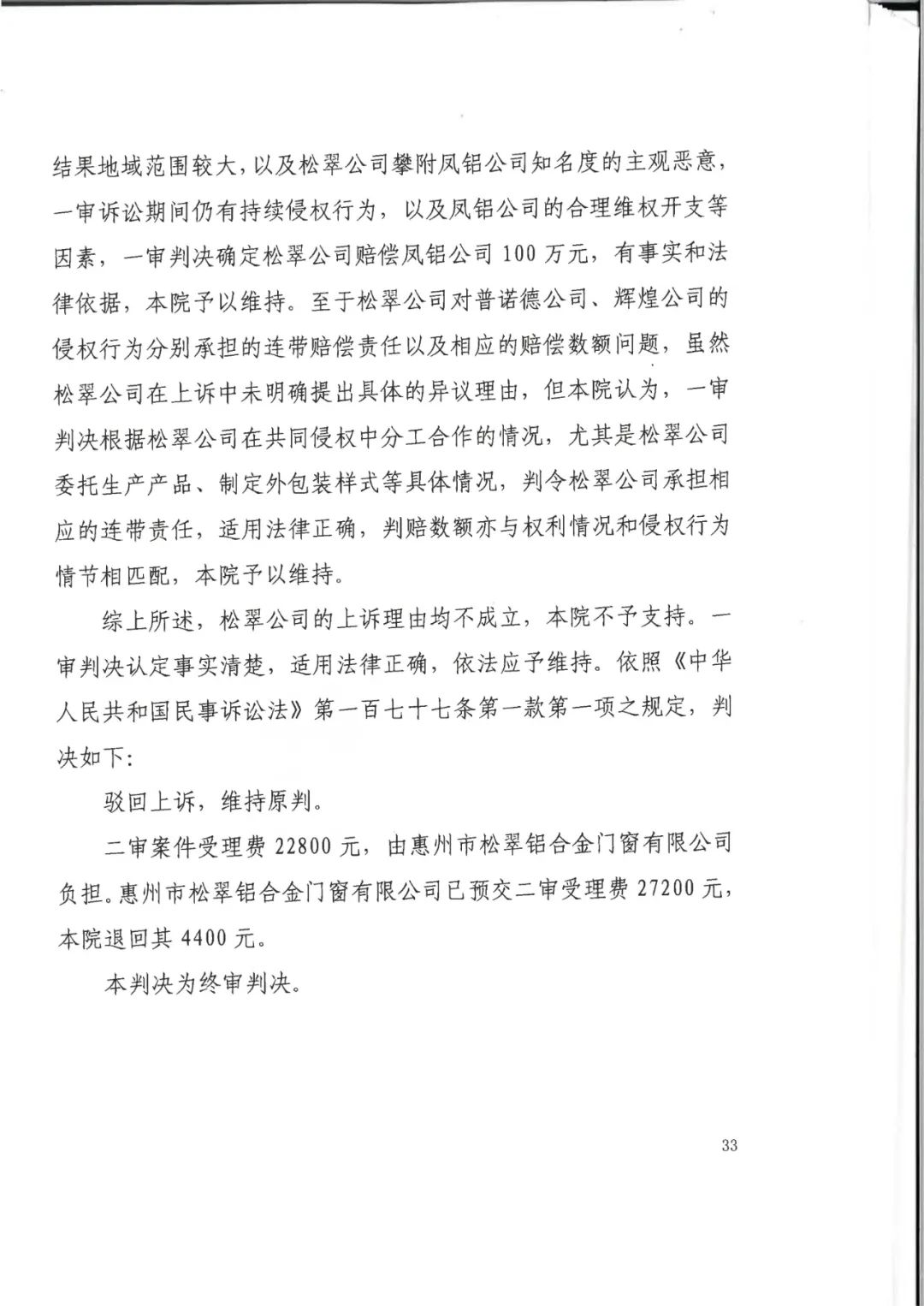 广东省高级人民法院驳回上诉,维持原判!松翠公司赔偿我方当事人凤铝公司经济损失及合理维权费用共100万元;新丰经营部赔偿凤铝公司经济损失及合理维权费用共5万元;普诺德公司赔偿凤铝公司经济损失及合理维权费用共50万元;辉煌公司凤铝公司经济损失及合理维权费用共100万元。
